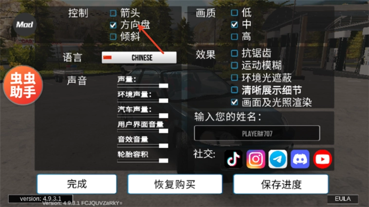 点击左上角的设置选项,玩家可以对箭头样式、方向盘模式、画面质量、语音功能以及声音大小等进行个性化设置。