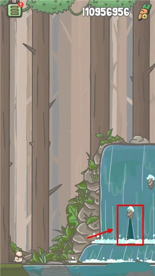 连续点击瀑布上方被卡住的金锄头,次数达到200下以上,就能把金锄头拔出来。