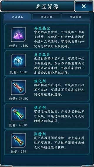 异星材料的数量直接影响着你的异星科技发展,所以一定要记得每天挖一次白矿,挖到晶尘满了就可以停手,别像我一样到最后缺材料没法升级。稳定剂和催化剂大家应该都囤了不少,但唯独润滑剂总是不够用。分享个小窍门:每天中午再去领取,而且要特意找等级低的去领,另外大家可以每天去异星商店逛一圈,说不定能碰到意外的惊喜。