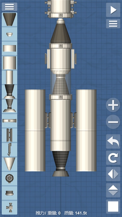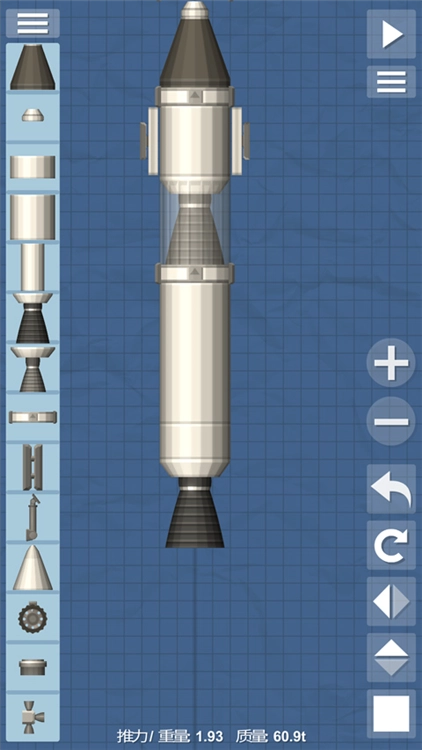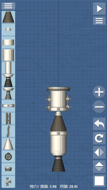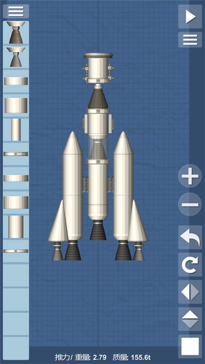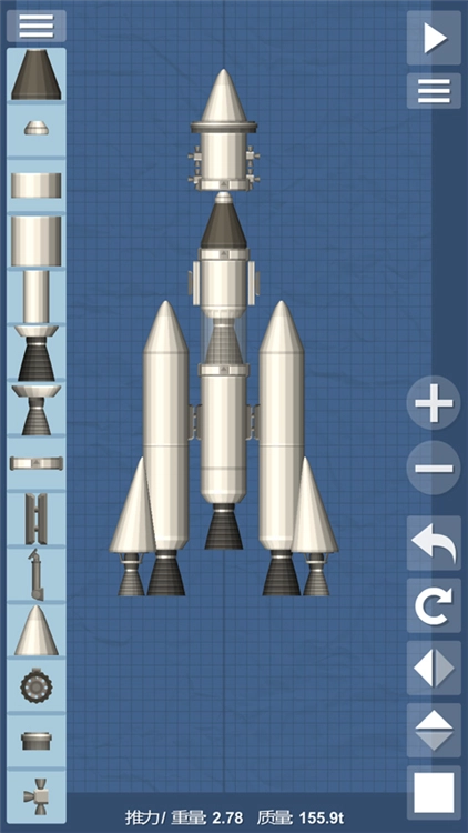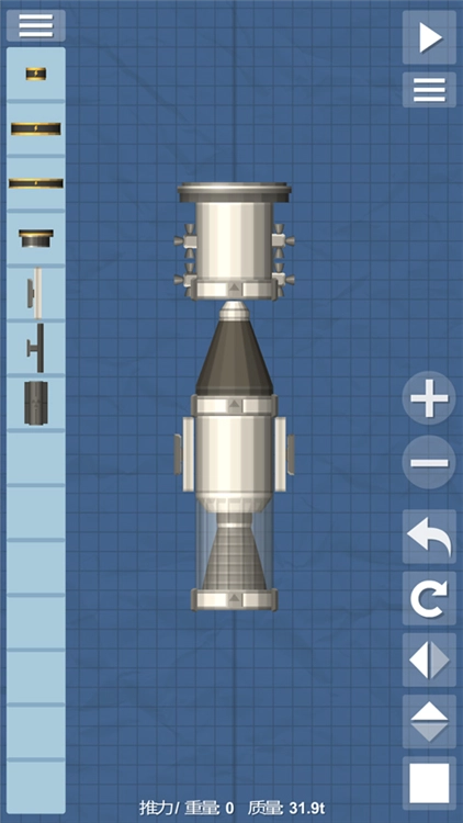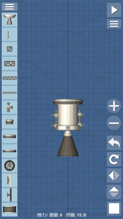 首先打开游戏创建一枚新火箭,火箭的布局以正三角形为设计思路,采用下方较粗、上方较细的结构,这样能实现比较理想的配重比。