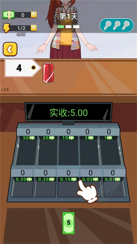 这里需要给她找零钱,你先把5块拖到5元的位置,接着再拖到一元的位置完成拆分,之后就能找给她一元了。