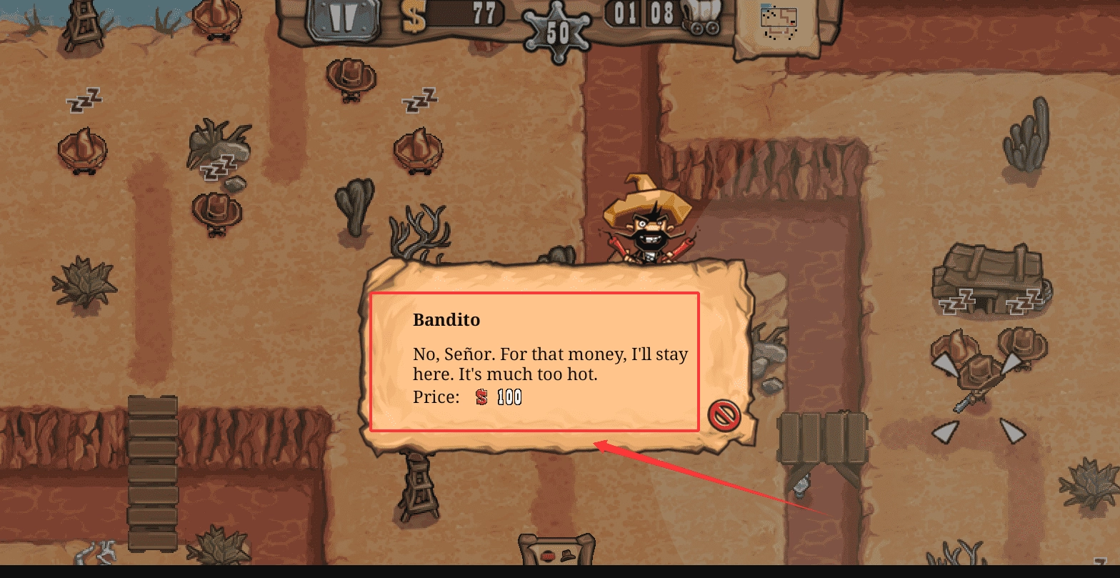 接着,第一张图呈现了一个具体的游戏场景,其中有角色“Bandito”以及对话内容,对话里提及了金钱、天气炎热,并且价格为800美元。