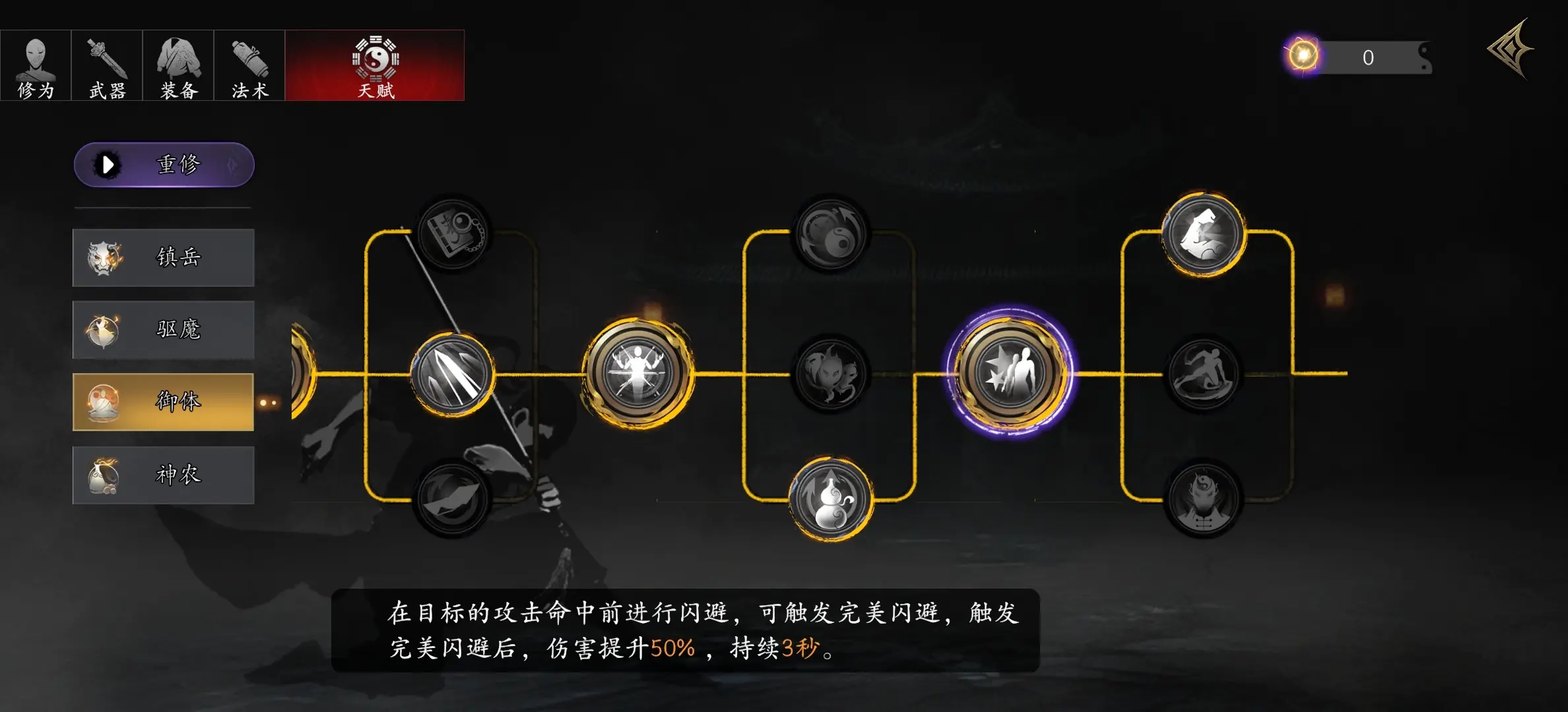 天赋加点建议:首先解锁法器,接着点出完美闪避后增加50%攻击的效果,最后再把攻速相关的点加上——这样搭配幽冥的话,攻速能和剑媲美。