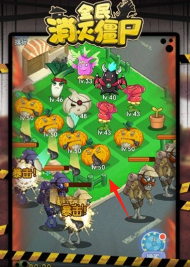 植物布阵选用等级50的南瓜、等级46的萝卜等植物,构建防御阵型以攻击摇滚僵尸、运动僵尸等目标。