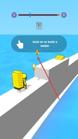 遇到高台时,长按“Hold on to build a ladder”按钮,消耗金币搭建梯子,以此翻越障碍,继续奔跑。