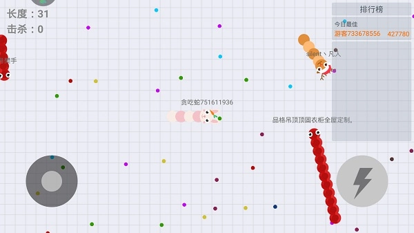 你可以通过操控摇杆来控制小蛇的移动方向,当小蛇吃掉地图上那些彩色的小圆点后,它的身体就会随之变长。