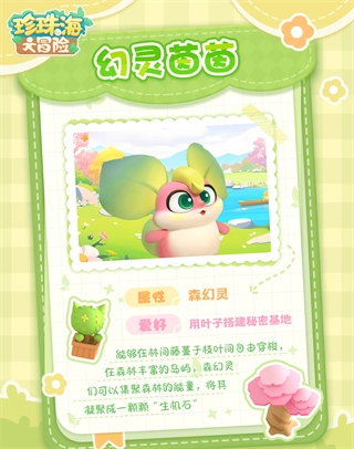 幻灵苗苗 属性:森 爱好:用叶子搭建秘密基地 它能在林间的藤蔓枝叶间灵活穿梭,还能汇聚森林的能量,凝结成名为“生机石”的宝物。