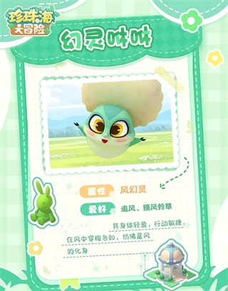 幻灵咻咻 属性:风幻灵 爱好:追逐清风、采摘风铃草 身姿轻盈灵动,宛如风的具象化身