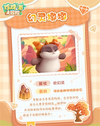 幻灵墩墩属性:岩幻灵 爱好:寻觅奇特岩石 身躯由古老岩层组成,可感知并汲取岩脉能量,痴迷于发掘珍稀晶矿