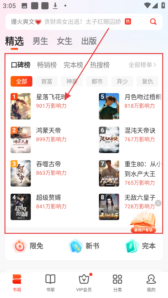 进入软件后,我们可以看到各类榜单上的小说,要是对某本小说感兴趣,点击它的封面或者标题就可以了。