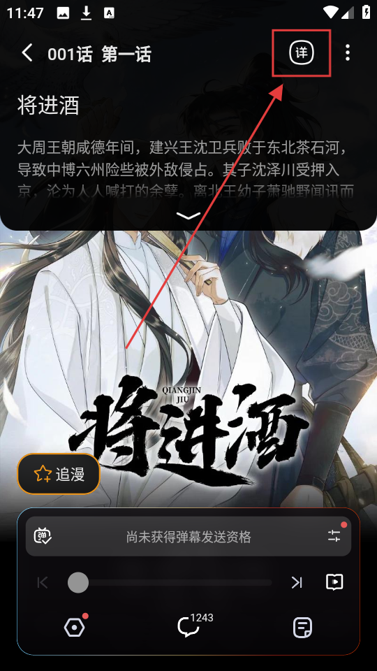 进入漫画页面后,点击右上角的【详】按钮,就可以查看该漫画的详细信息啦。