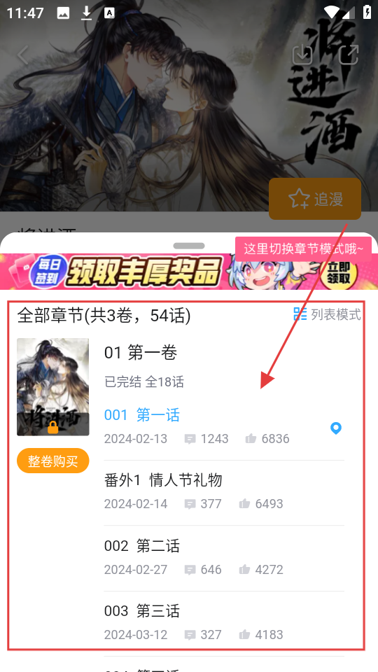 在详情页点击【目录】按钮,即可查看该漫画的全部章节列表,十分便捷。