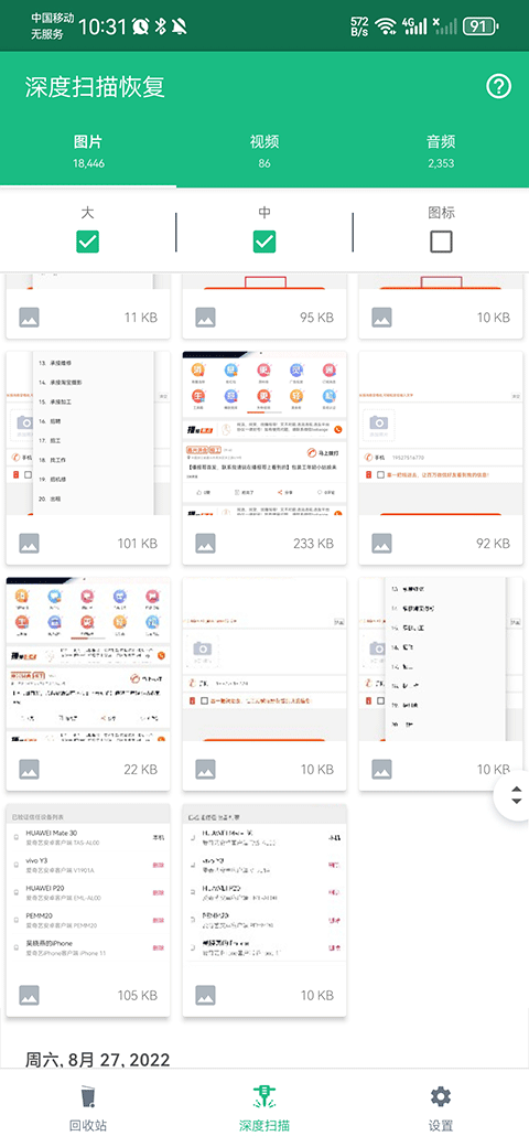在软件里打开深度扫描界面后,系统就会自动对之前删除过的图片、视频以及音频文件进行扫描