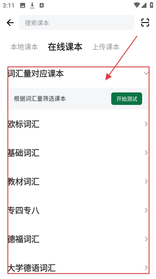 进入课本选择界面后,会看到【词汇量对应课本】【欧标词汇】等不同分类,你可以根据自身需求直接选择课本,也能通过测试来筛选合适的课本。