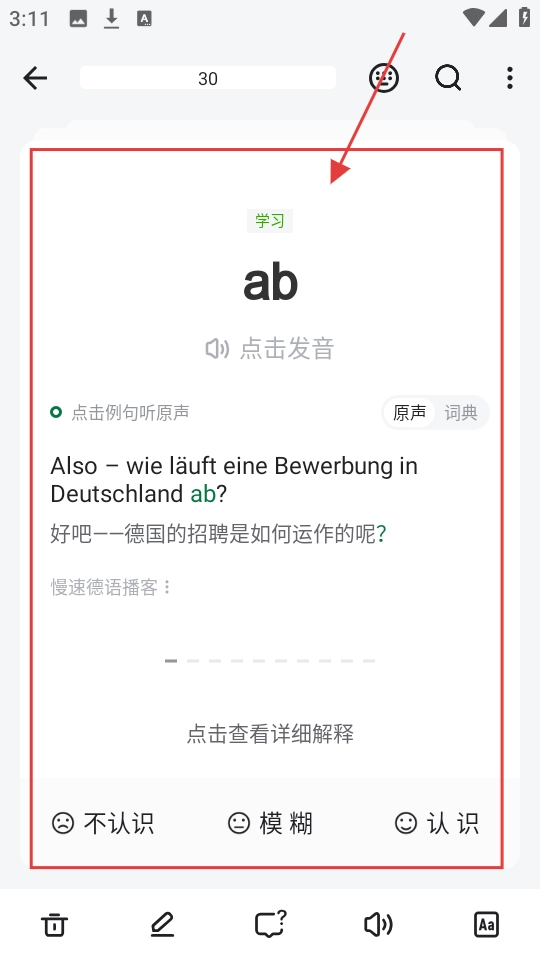 在单词学习界面中,你可以看到单词本身、对应的发音以及相关例句等内容,能够按照给出的提示进行学习,并且可以标记自己对每个单词的熟悉程度。