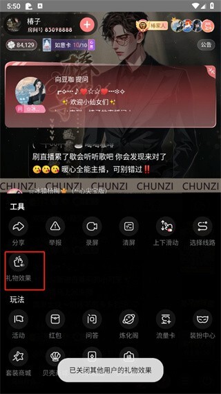 最后点击完成后,在页面下方弹出的对话框里,我们点击关闭【礼物效果】的按钮就可以了。