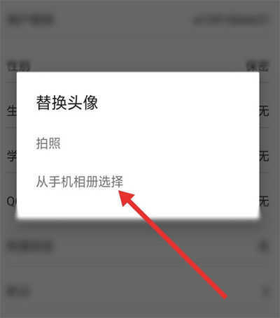 此时会弹出一个对话框,选择从手机相册选取图片作为新头像(此处以该选项为例进行说明)。