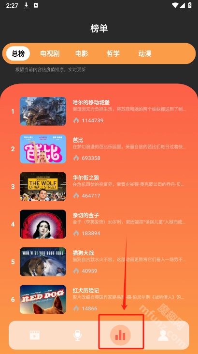 如图所示,点击底部第三个图标会跳转到影视榜单排行榜页面。