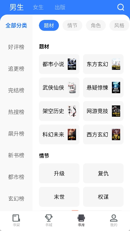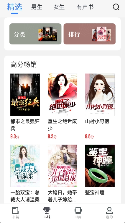 在书城页面,你可以浏览各类小说,这里划分了精选、男生、女生、有声书等不同分类。