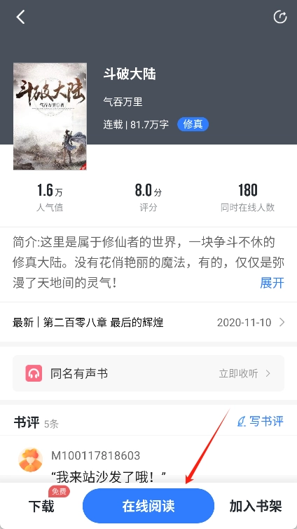 小说阅读:找到您想要阅读的小说后点击进入详情页面,然后点击“在线阅读”按钮;