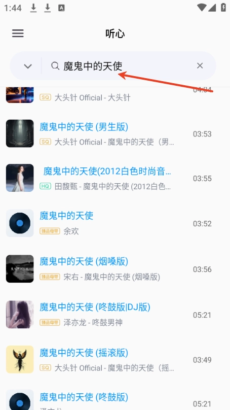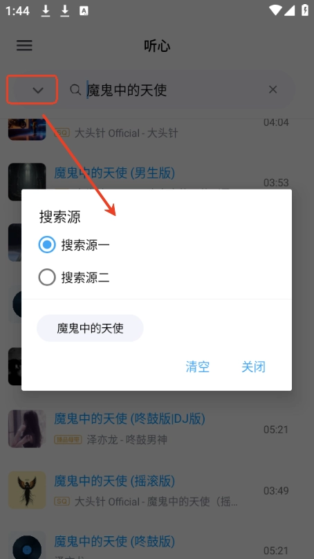 点击左侧的小三角就能切换搜索源,找到目标歌曲后选择对应的音质就可以了。