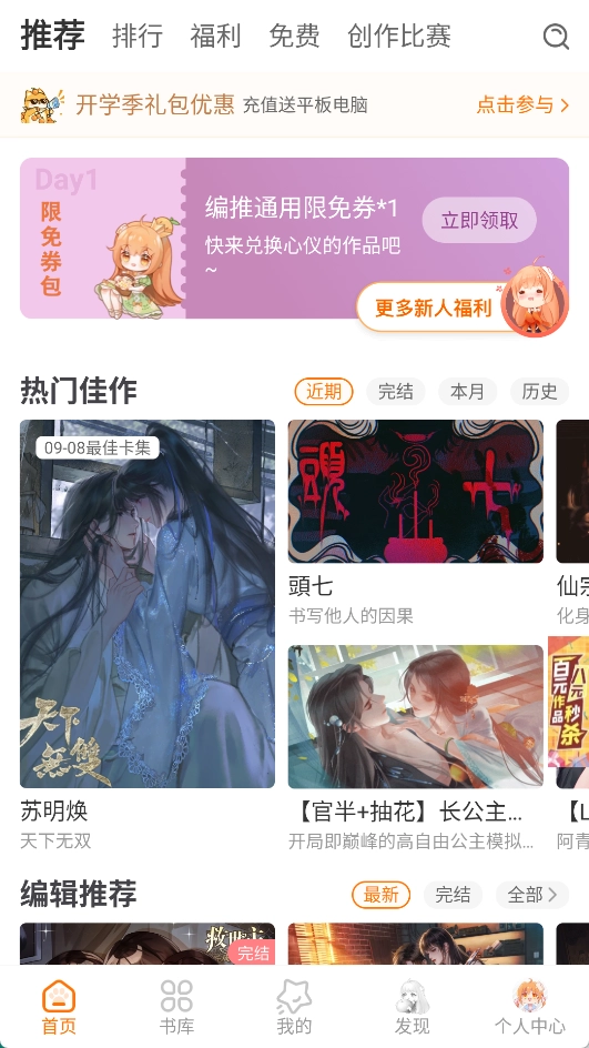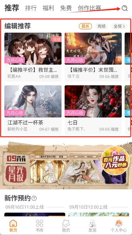 在首页,你既能够借助主编推荐、类型分类等途径来浏览作品,也可以运用搜索功能去查找作品。