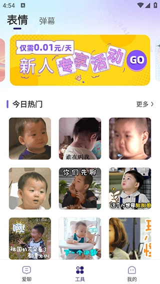 在“工具”页面新增表情包与弹幕功能,聊天时能快速发送,同时也提供表情套图。