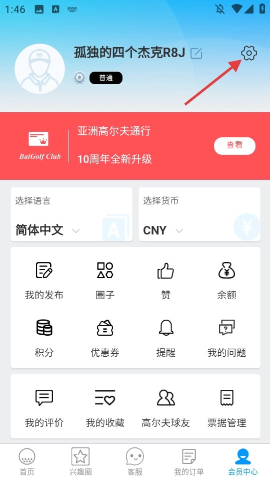 在会员中心页面点击右上角设置图标,进入设置界面。