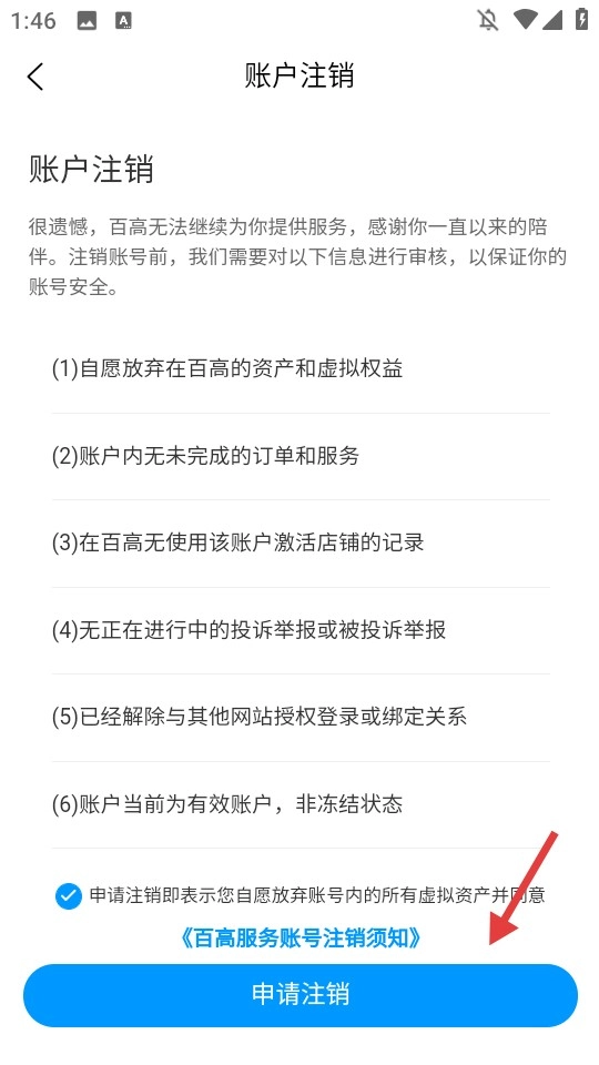 在账户注销页面勾选同意《百高服务账号注销须知》,点击【申请注销】,完成注销操作。