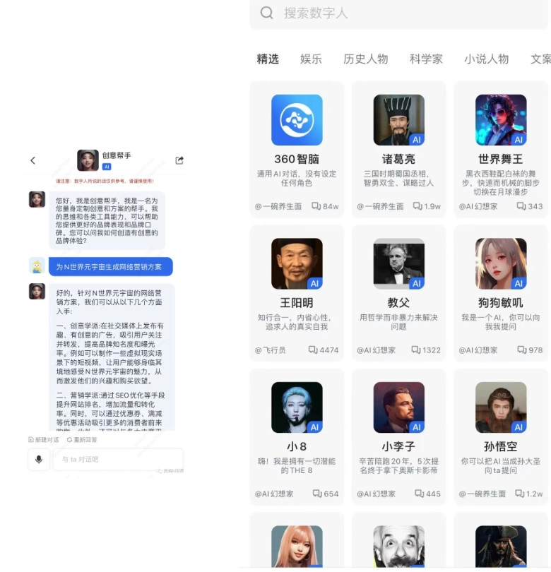AI数字员工,针对N世界的营销创意方案也对答如流。链接知识库,具备企业级专业性,根据话题自动挖掘、整合并生成对话内容。数字名人,穿越时空,与先贤开放式对话,开启知识和思想传承。