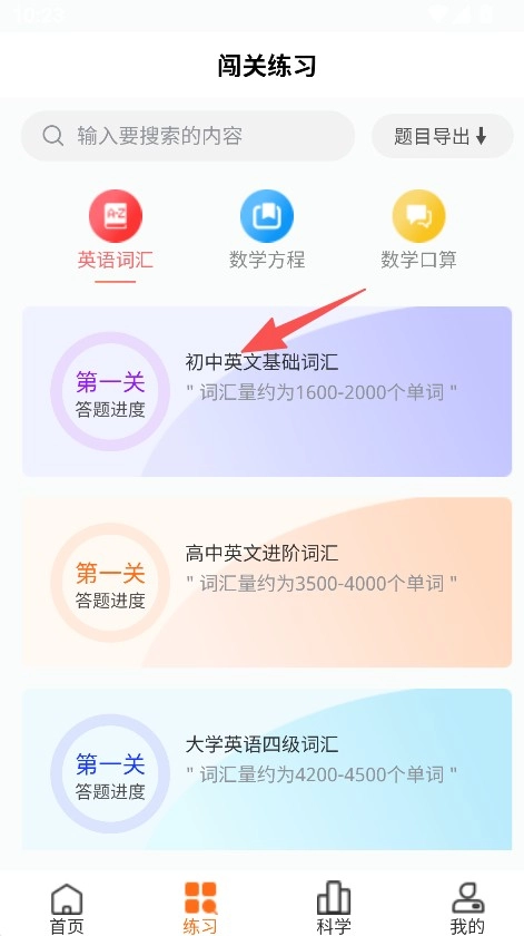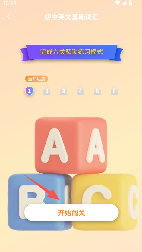 英语词汇学习可分阶段开展,涵盖初中基础、高中进阶以及大学四级词汇这几个阶段。其中初中词汇部分,学习者需通过六个关卡方可开启练习模式,并且该部分是依据学习难度来进行分层设计的。