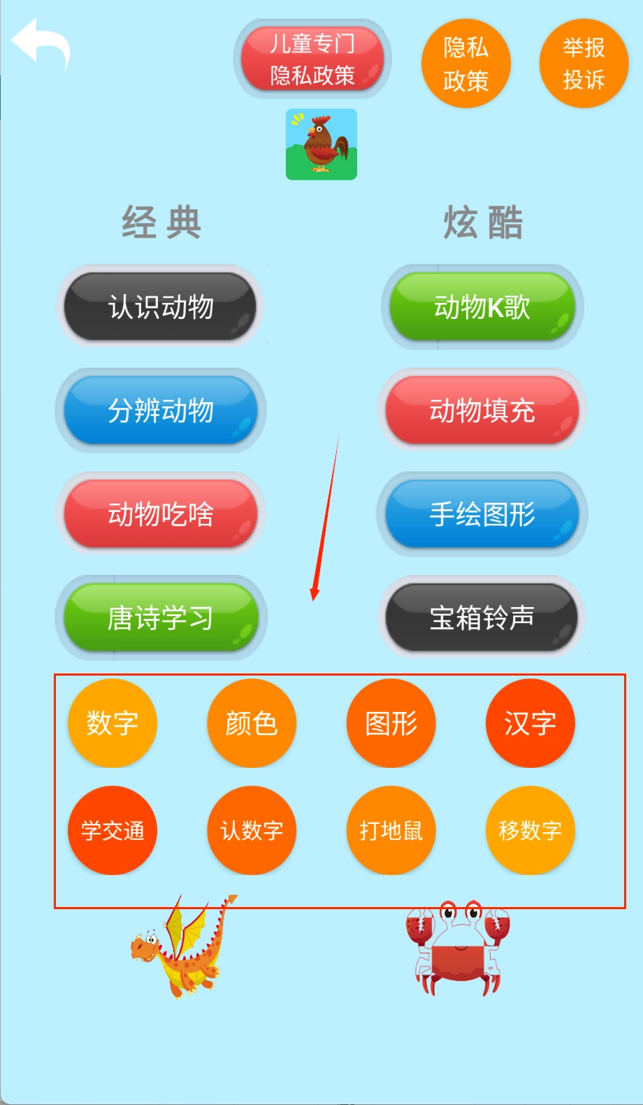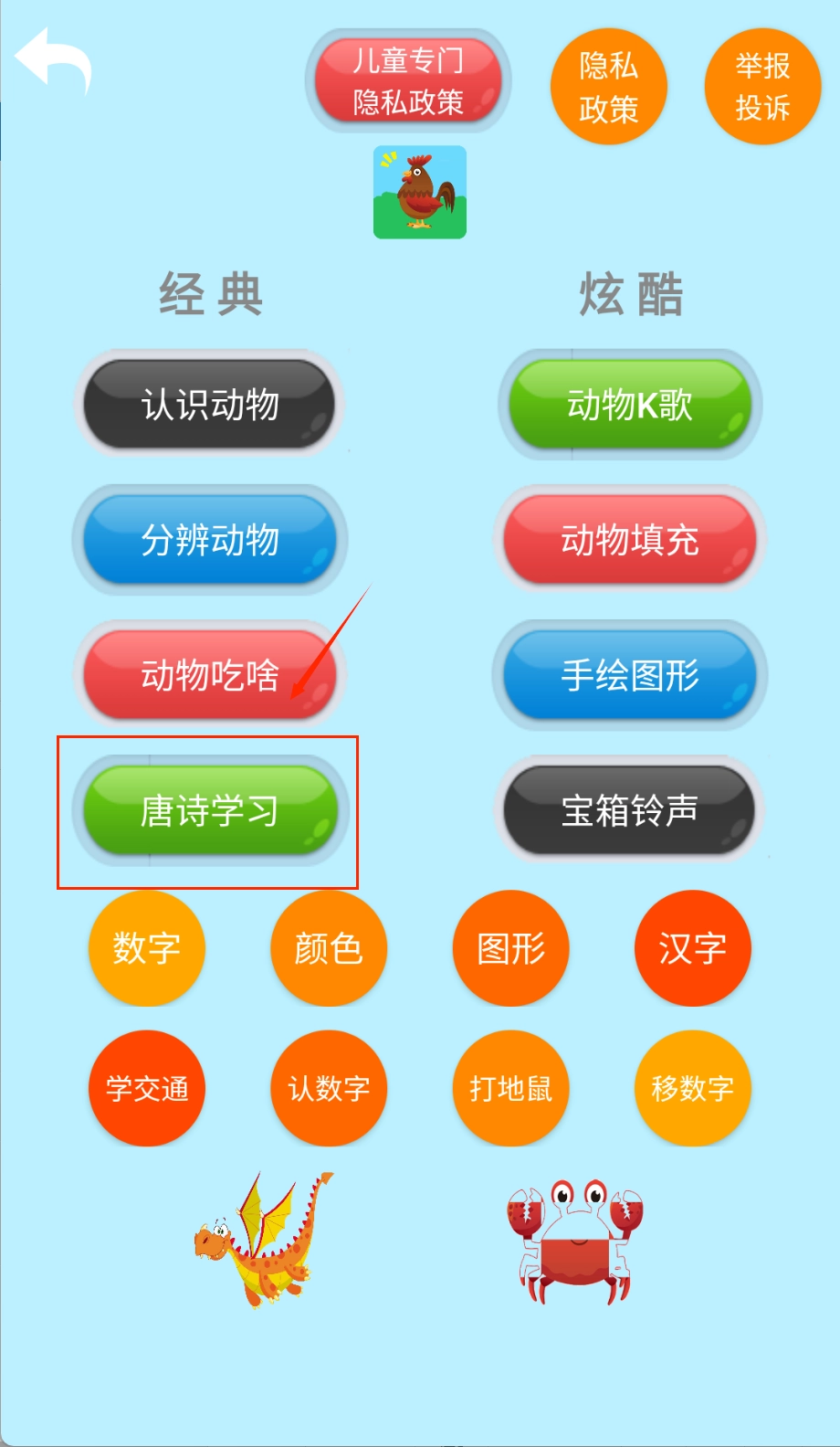 通过生动的动物形象和互动游戏帮助孩子认识各种动物,平台包含丰富的动物认知内容,采用卡通动画和语音讲解相结合的方式,激发孩子的学习兴趣,同时提供绘画创作和古诗词学习功能,让孩子在娱乐中学习知识,培养多元智能发展。打开应用后,色彩鲜艳的主界面便映入眼帘。进入动物认知模块,点击心仪的动物图标,即可欣赏该动物的动态演示,同时收听到专业的语音讲解。