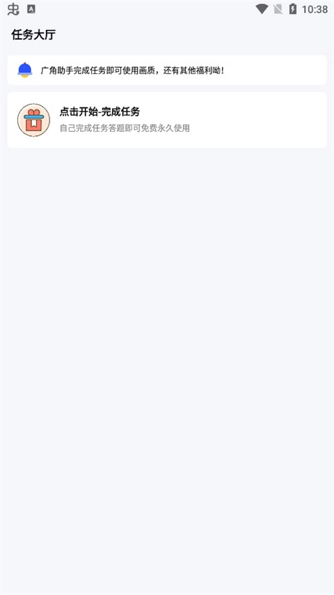 广角助手通过任务模式为用户提供永久免费服务。这种设计既能确保软件稳定运行,又能让玩家在完成任务时收获成就感。任务大多简单明了,不会给玩家造成过多压力,还能提升软件的互动性与趣味性。
