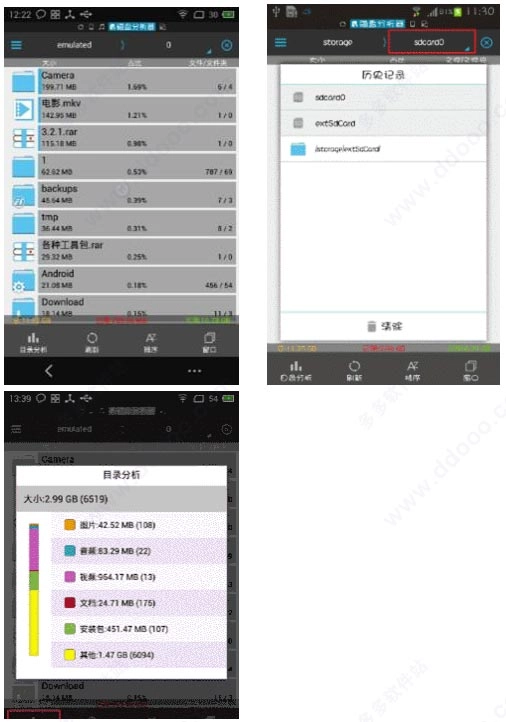 打开快捷导航后依次进入工具、磁盘分析器,这里能清晰展示sdcard的总容量、已用容量和可用容量,同时呈现各个文件夹或文件的大小、占比,以及它们包含的文件与文件夹数量;长按对应项目即可直接执行删除操作。点击地址栏可实现外置卡的切换。点击目录分析功能,就能查看当前路径下图片、音频、视频、文档、安装包及其他类型文件各自占用的容量情况。