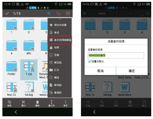当您需要将文件备份到网络硬盘时,无需反复切换窗口进行复制粘贴操作,只需长按文件,依次点击“更多”选项,选择“备份到网络硬盘”即可完成操作。系统会默认在网络硬盘中创建一个名为“XX的ES备份”的备份目录,您可以根据需求修改该目录名称,也可选择是否将其设为默认备份目录。
