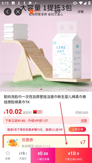 用券购物再加上下单立返的双重优惠,能显著减少购物开销,坚持使用能省下不少钱。