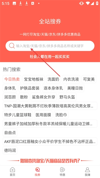 在【全站搜券】的搜索框中输入商品名称或者关键词来搜索优惠券。
