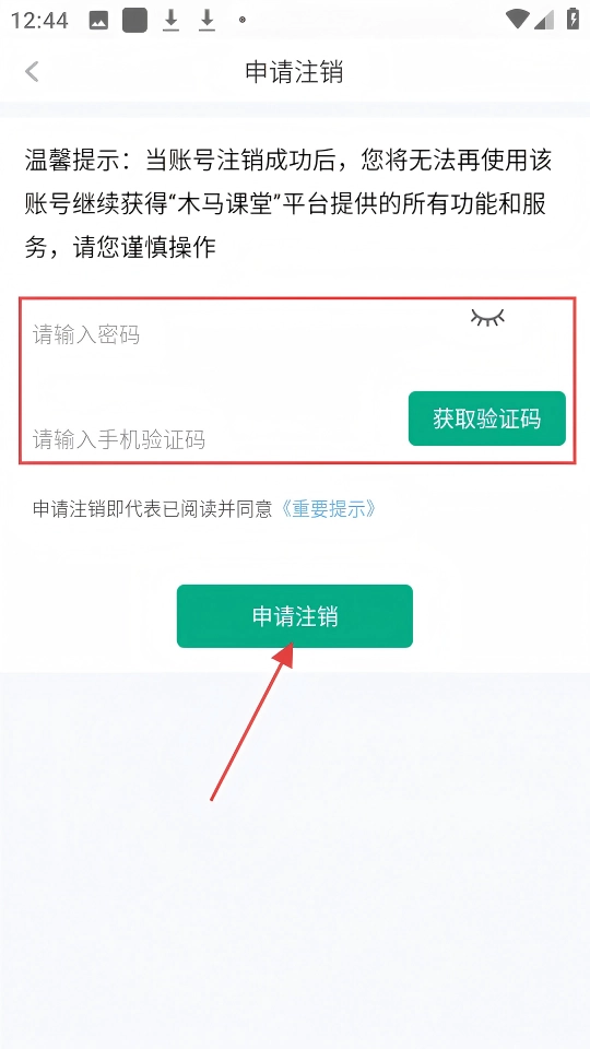 在【申请注销】页面,输入密码并获取手机验证码后,点击【申请注销】按钮即可完成账号注销操作。