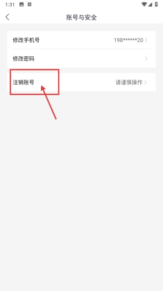 在账号与安全页面,找到并点击注销账号选项,即可发起账号注销操作。