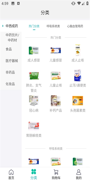 在分类板块同样能查看各类药物选择,涵盖食品、医疗器械、非药品、化妆品等类别。