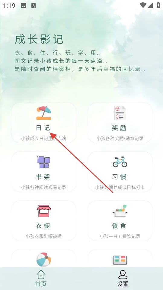 进入成长影记后,找到并点击【日记】选项,即可进入成长日记页面。