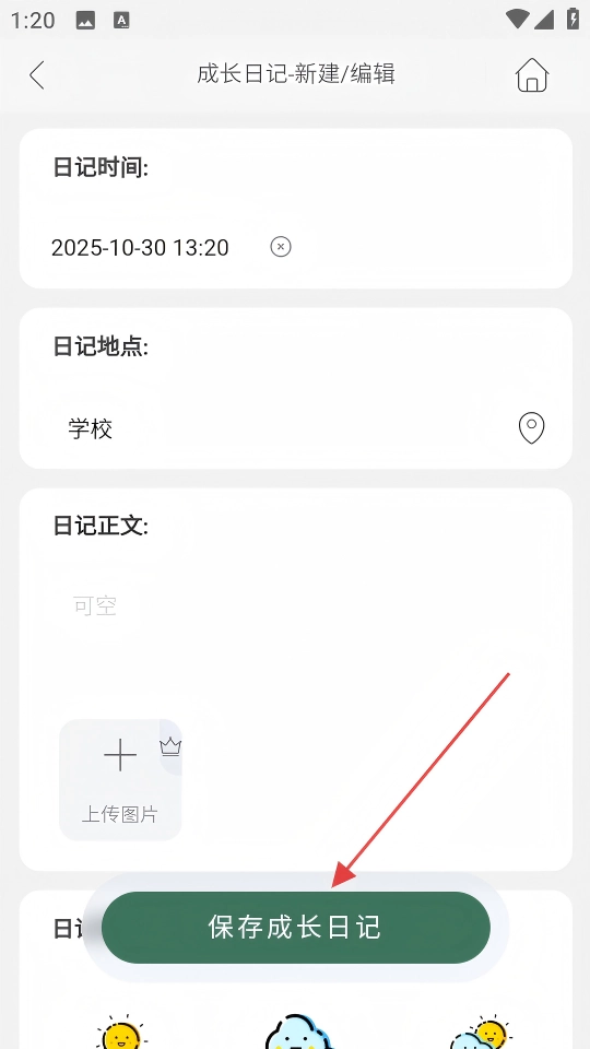 在成长日记页面,填写好日记相关信息后,点击【保存成长日记】按钮,即可完成日记的保存操作。