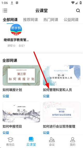 在云课堂界面中,找到并点击“如何管理科室和人员”这门目标课程,即可进入该课程的详情页面。