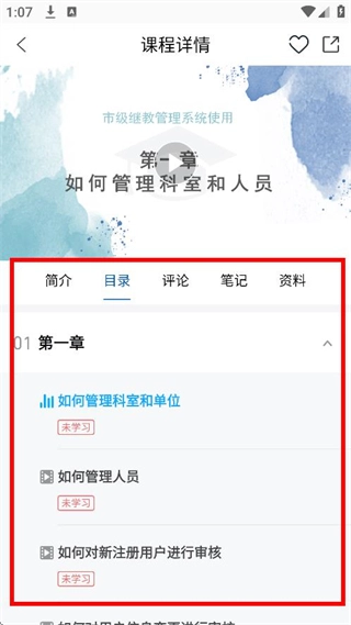 点击目录里的具体章节,比如《如何管理科室和单位》,就能开始学习课程内容了。