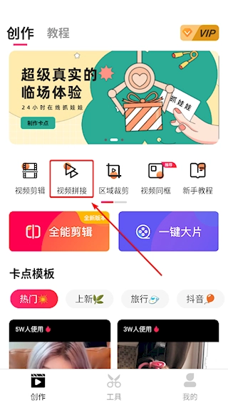 打开爱剪辑后,在创作界面点击【视频拼接】按钮;