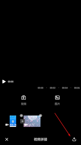 拖动视频调整拼接顺序后,点击右下角的按钮导出。