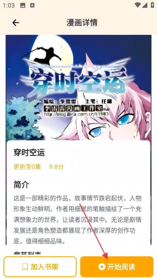在我的书架页面,点击《穿时空运》漫画,即可进入该漫画的详情页面。