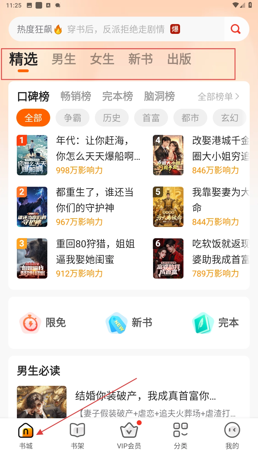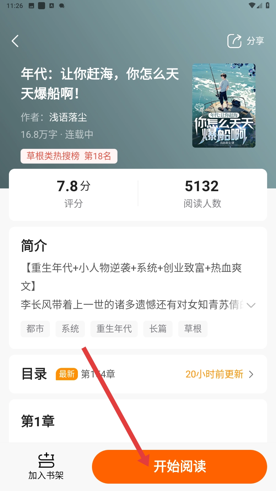 在【书城】板块的【精选】等分类栏目里,挑选自己感兴趣的小说,比如《年代:让你赶海,你怎么天天爆船啊》。