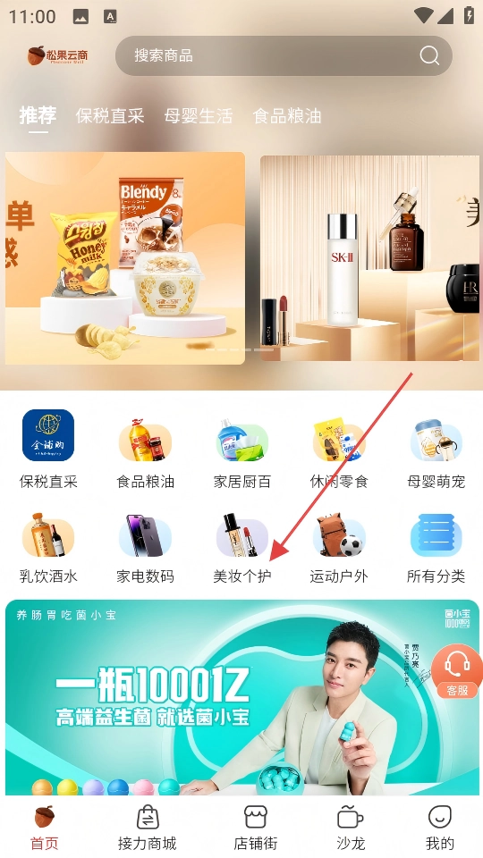 进入【松果云商】的首页后,找到并点击【美妆个护】分类选项,即可进入美妆个护的商品分类页面。