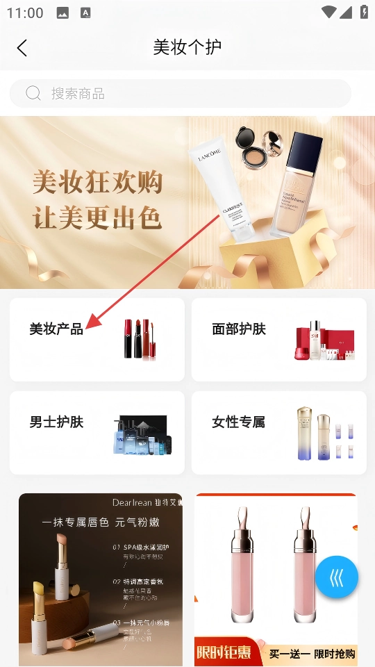 在【美妆个护】页面,找到并点击【美妆产品】选项,即可进入美妆产品的商品列表页面。